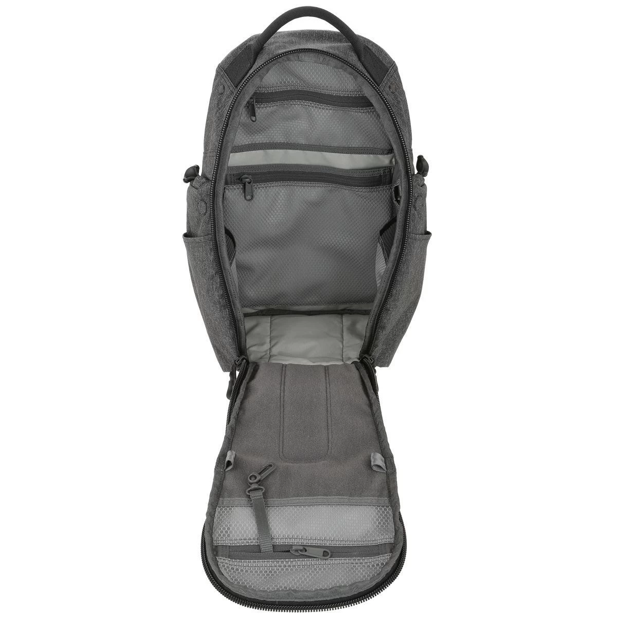 - Main compartment with clamshell opening, detachable and concealable