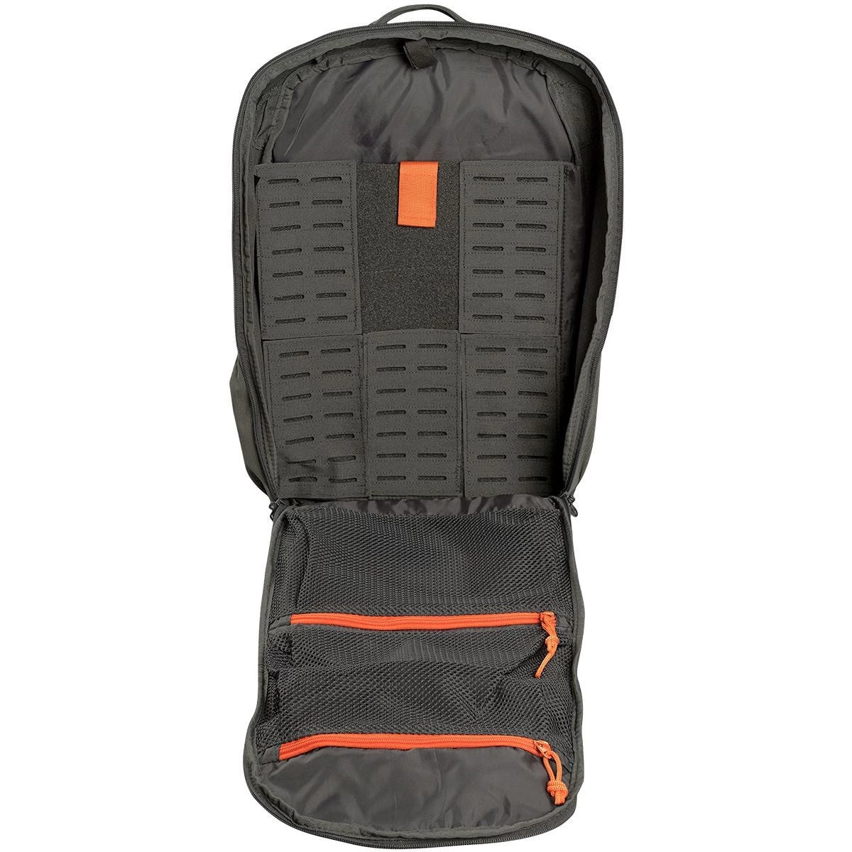 clamshell opening, five hook-and-loop reconfigurable/removable MOLLE